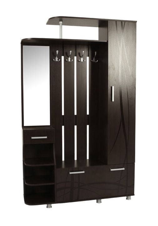 Компактная, но вместительная прихожая содержит в себе все необходимые элементы. Это и открытая вешалка с крючками для объемной верхней одежды, и закрытый шкаф, и обувница и даже полочка для головных уборов. Также небольшая панель с зеркалом размером 310х930 мм и ящичком и полочками для необходимых под рукой мелочей. Выдвижной ящик на шариковых направляющих. Фасад шкафа декорирован изящным рисунком. Прихожая универсальна по сборке. Изделие выполнено из высококачественной ЛДСП отечественного производства. Края отделаны кромкой ПВХ 0. 4 и 1 мм. Изделие поставляется в разобранном виде, хорошо упаковано в гофротару. В комплект входит инструкция.