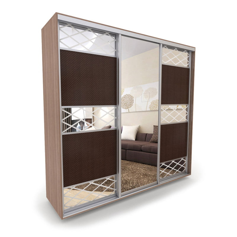 Двери купе выполнены в комбинации эко-кожи "Версаль" и зеркальной вставки с пескоструйной обработкой. Центральная дверь - зеркальная. Рисунок обработки "ромбы" фон зеркальный, рисунок - матовый. Для темных тонов ЛДСП корпуса используется темный цвет эко-кожи, для светлых тонов – светлая. Высококачественный толстостенный алюминиевый профиль цвета хром матовый.