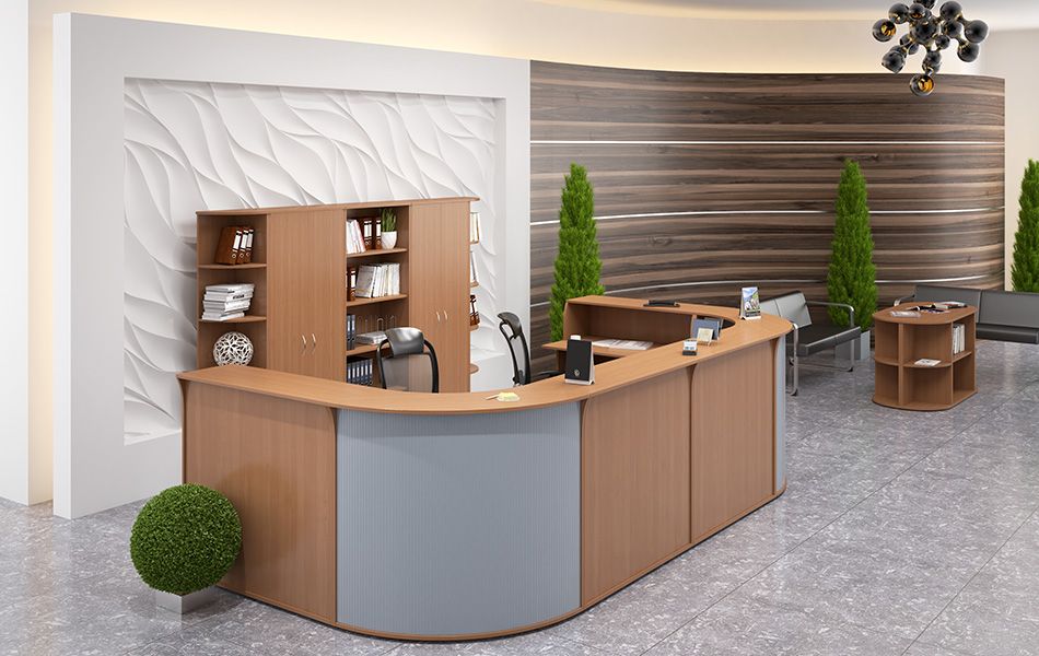 Административная стойка ресепшн Imago-R для секретаря, способна придать изысканность и комфорт приемной зоне офисного пространства. Конструкция стойки составляется из набора угловых и прямых модулей, которые следует комплектовать прямолинейными столами. Коллекция ресепшн Имаго относится к недорогим моделям офисной мебели для приемной.